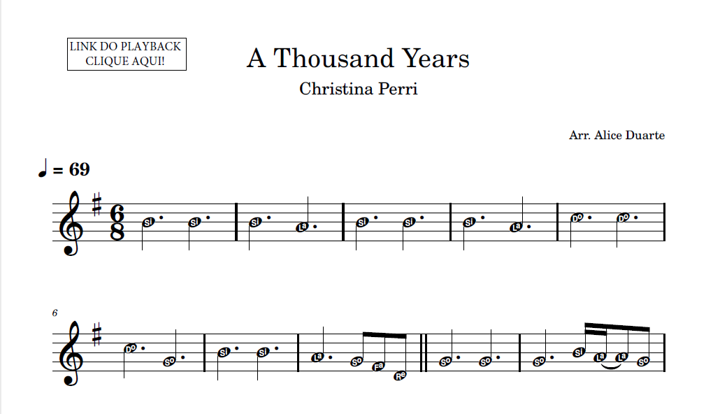 Partitura em formato PDF, com melodia na clave de sol, nome das notas e link para o playback utilizado no vídeo.