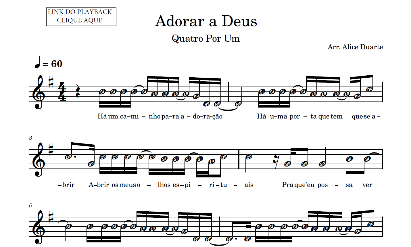 Partitura em formato PDF, com melodia na clave de sol, letra da música, nome das notas e link para o playback utilizado no vídeo.
