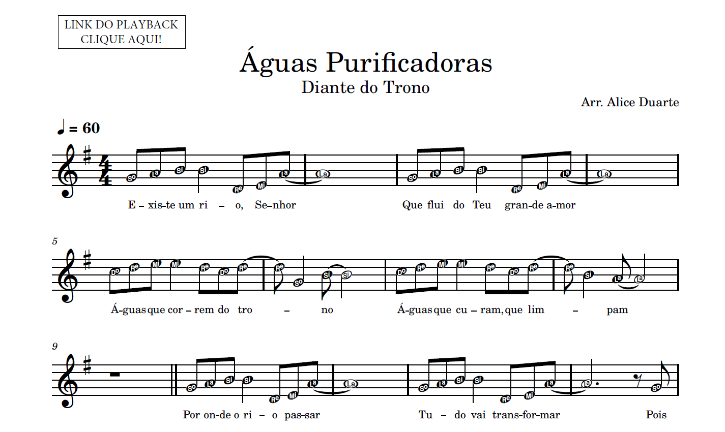 Partitura em formato PDF, com melodia na clave de sol, letra da música, nome das notas e link para o playback utilizado no vídeo.