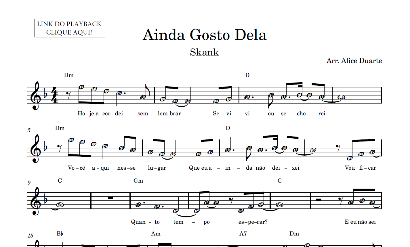 Partitura em formato PDF, com melodia na clave de sol, letra da música, nome das notas e link para o playback utilizado no vídeo.