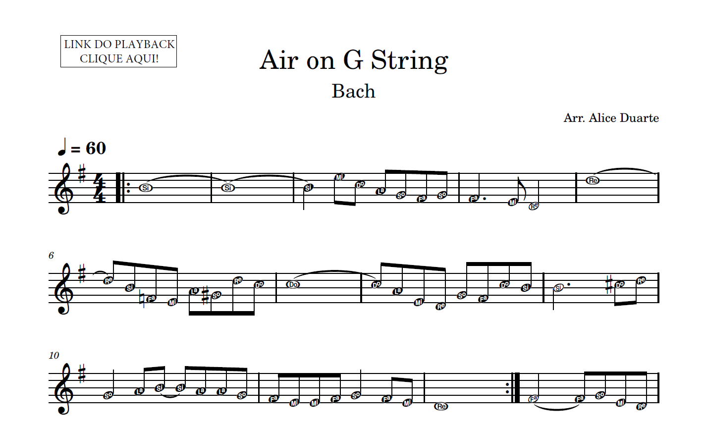 Partitura em formato PDF, com melodia na clave de sol, nome das notas e link para o playback utilizado no vídeo.