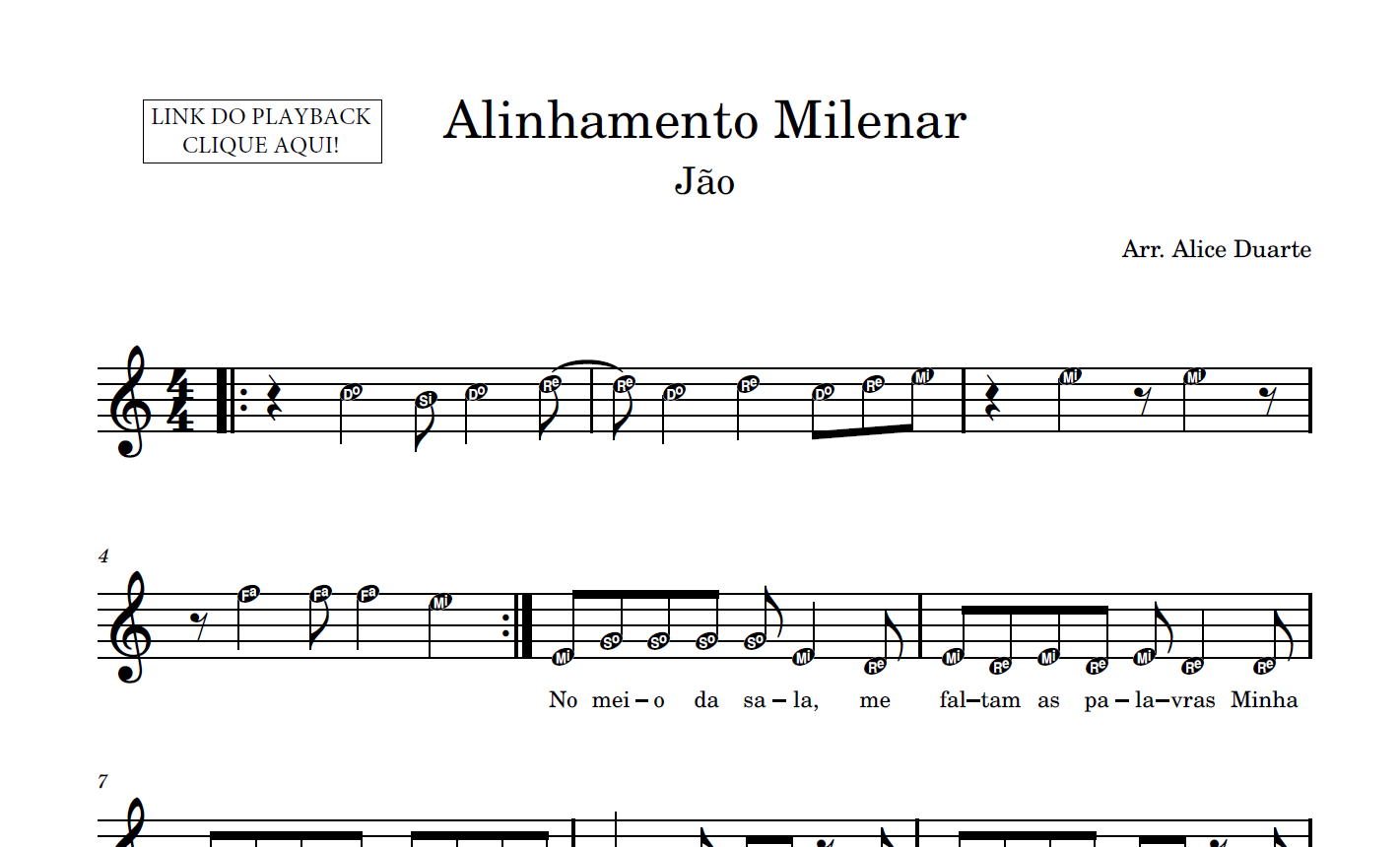 Partitura em formato PDF, com melodia na clave de sol, letra da música, nome das notas e link para o playback utilizado no vídeo.
