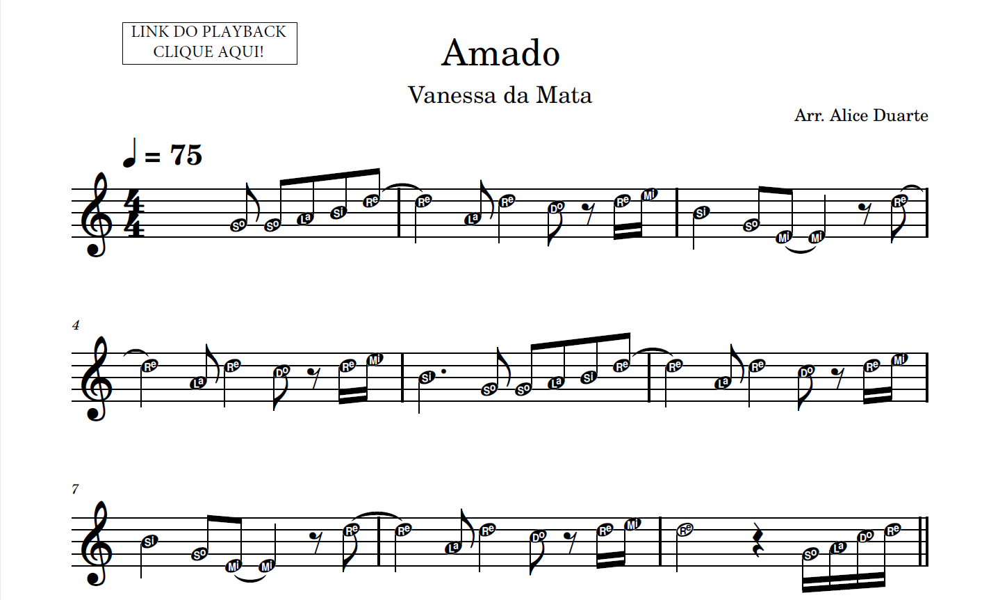 Partitura em formato PDF, com melodia na clave de sol, letra da música, nome das notas e link para o playback utilizado no vídeo.