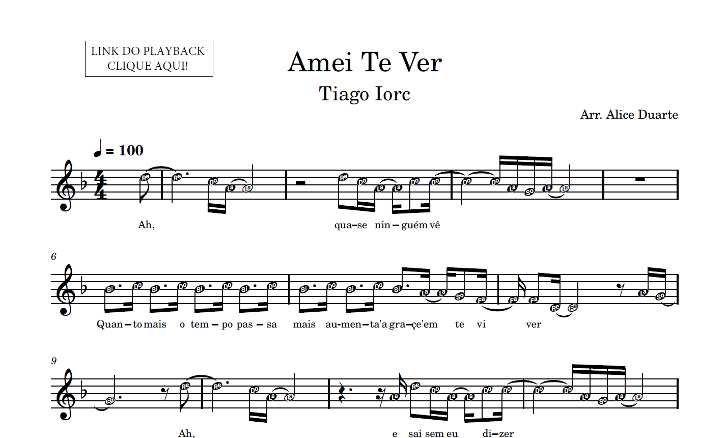 Partitura para instrumentos afinados em si bemol como: Sax Tenor, Sax Soprano, Clarinete em Si Bemol e Trompete em Si Bemol com a transcrição do arranjo da música “Amei Te Ver”, de Tiago Iorc.