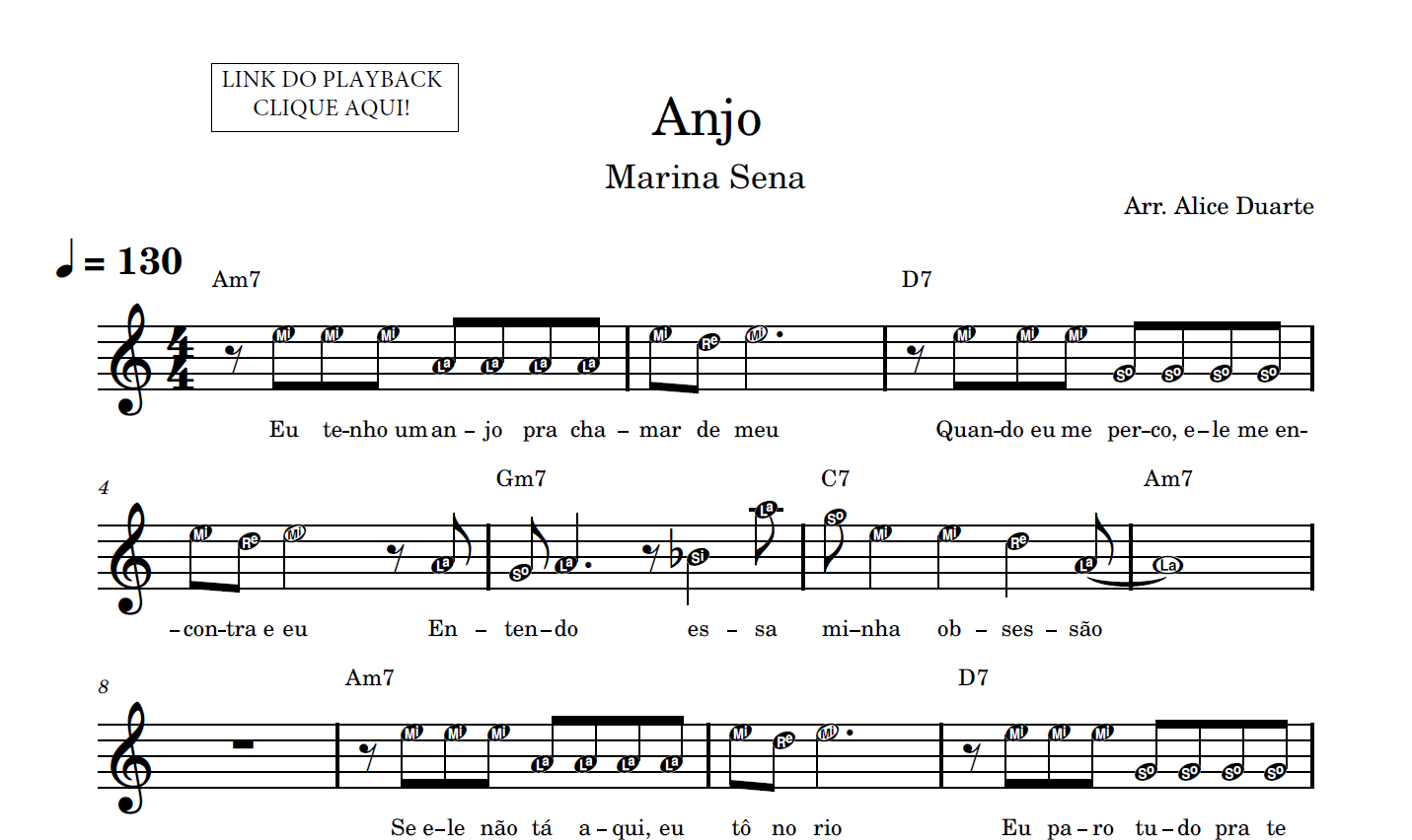 Partitura facilitada com a transcrição do arranjo da música “Anjo”, de Marina Sena, disponível em vídeo no link do YouTube: Anjo (Marina Sena) | Tutorial | Aprenda a tocar com Partitura Facilitada + Playback