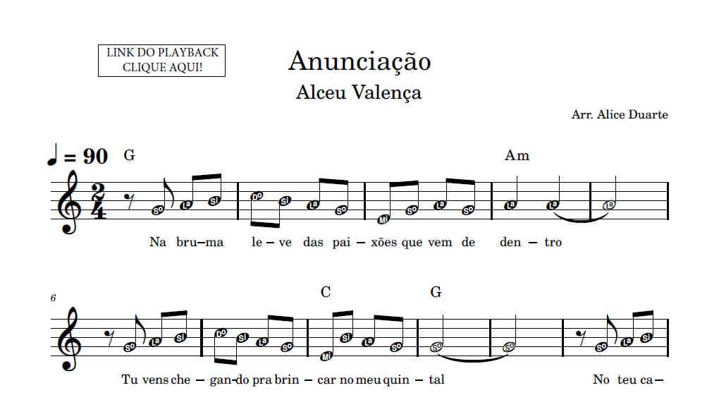 A partitura é em formato PDF e contém melodia, legenda de notas, cifragem, letra da música e link clicável do playback utilizado no vídeo.