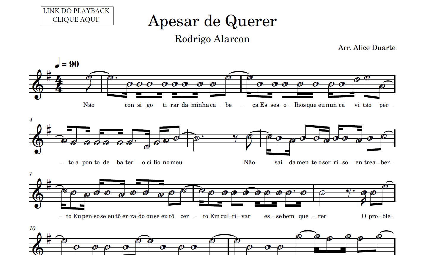 Partitura em formato PDF, com melodia na clave de sol, letra da música, nome das notas e link para o playback utilizado no vídeo.