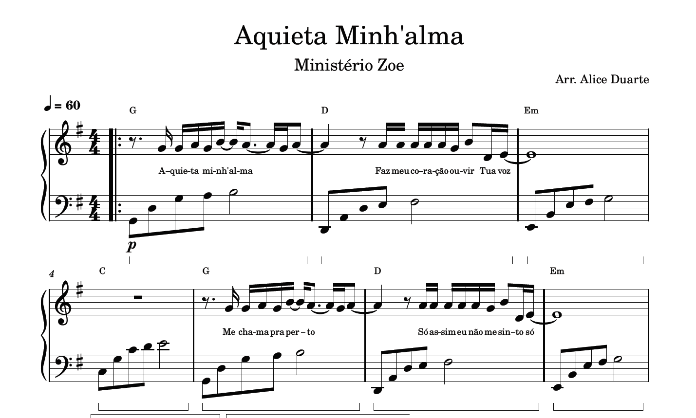 Partitura com a transcrição do arranjo da música “Aquieta Minh’alma”, de Ministério Zoe, disponível em vídeo no link do YouTube: Aquieta Minh’alma (Ministério Zoe) | Piano Tutorial + Partitura