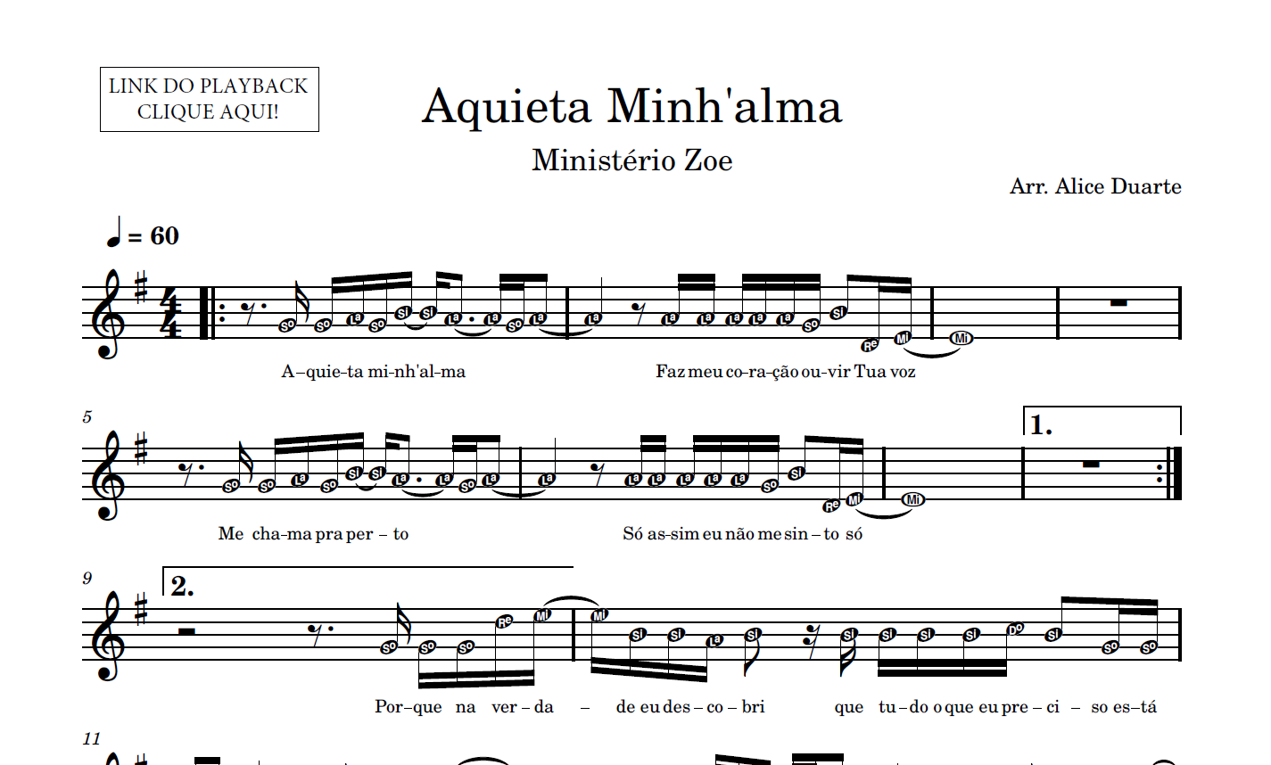 Partitura em formato PDF, com melodia na clave de sol, letra da música, nome das notas e link para o playback utilizado no vídeo.