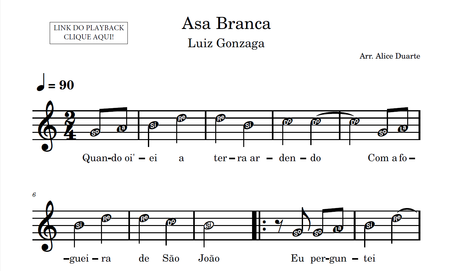 Partitura em formato PDF, com melodia na clave de sol, letra da música, nome das notas e link para o playback utilizado no vídeo.