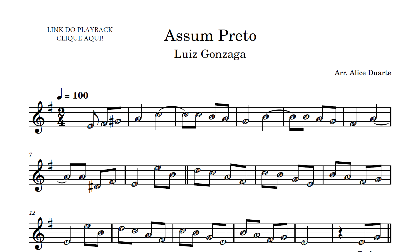 Partitura em formato PDF, com melodia na clave de sol, letra da música, nome das notas e link para o playback utilizado no vídeo.