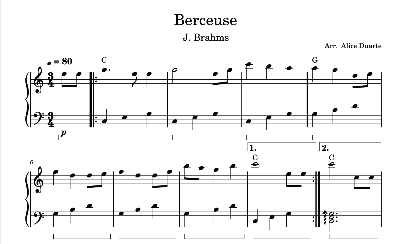 Partitura com a transcrição do arranjo da música “Berceuse”, de J. Brahms, disponível em vídeo no link do YouTube: Berceuse (J. Brahms) | Piano Tutorial + Partitura