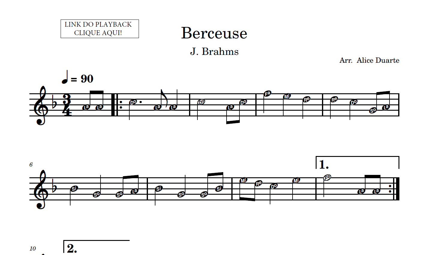 Partitura em formato PDF, com melodia na clave de sol, nome das notas e link para o playback utilizado no vídeo.