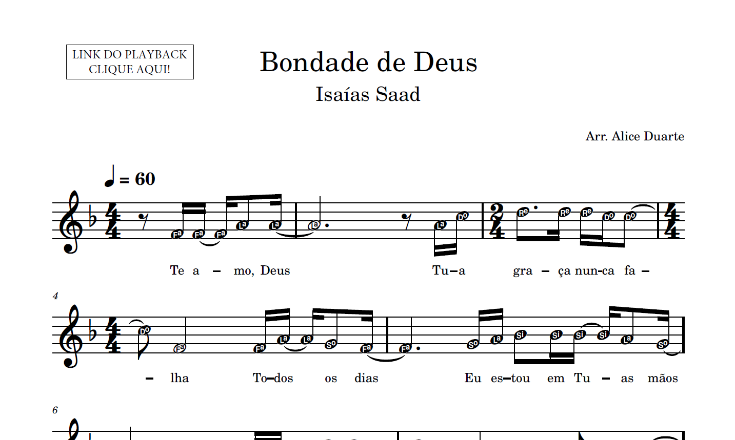 Partitura em formato PDF, com melodia na clave de sol, letra da música, nome das notas e link para o playback utilizado no vídeo.