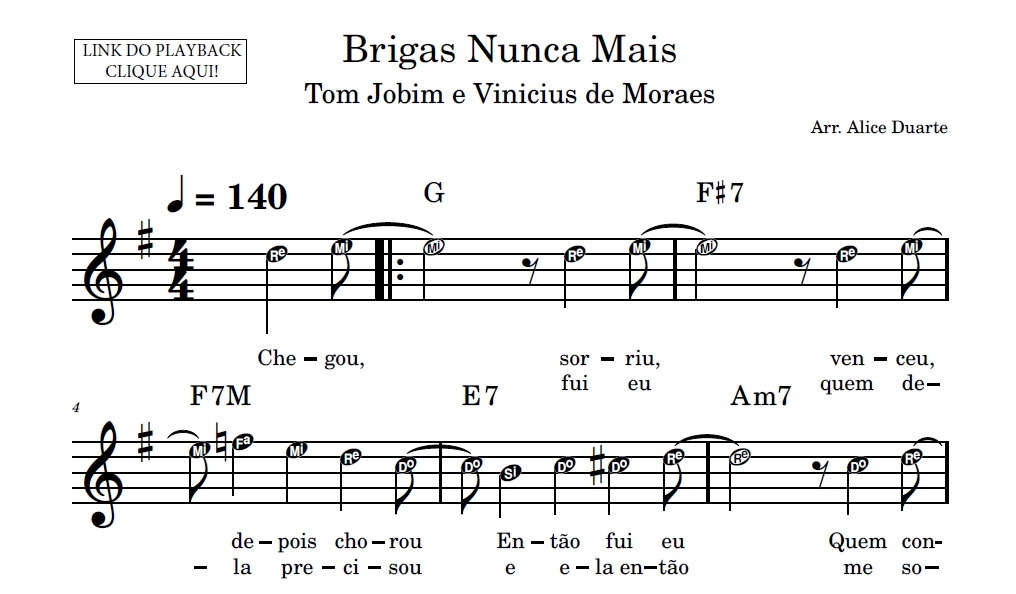 Partitura facilitada com a transcrição do arranjo da música “Brigas Nunca Mais”, de Tom Jobim e Vinicius de Moraes., disponível em vídeo no link do YouTube: Brigas Nunca Mais (Tom Jobim e Vinicius de Moraes) | Aprenda com Partitura Facilitada + Playback