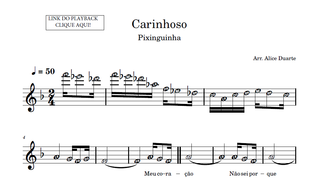 Partitura em formato PDF, com melodia na clave de sol, letra da música, nome das notas e link para o playback utilizado no vídeo.
