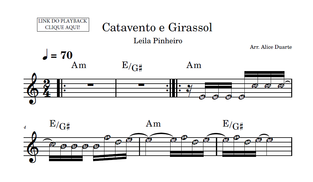 Partitura facilitada com a transcrição do arranjo da música “Catavento e Girassol”, de Leila Pinheiro, disponível em vídeo no link do YouTube: Catavento e Girassol (Leila Pinheiro) | Tutorial | Aprenda com Partitura Facilitada + Playback – YouTube
