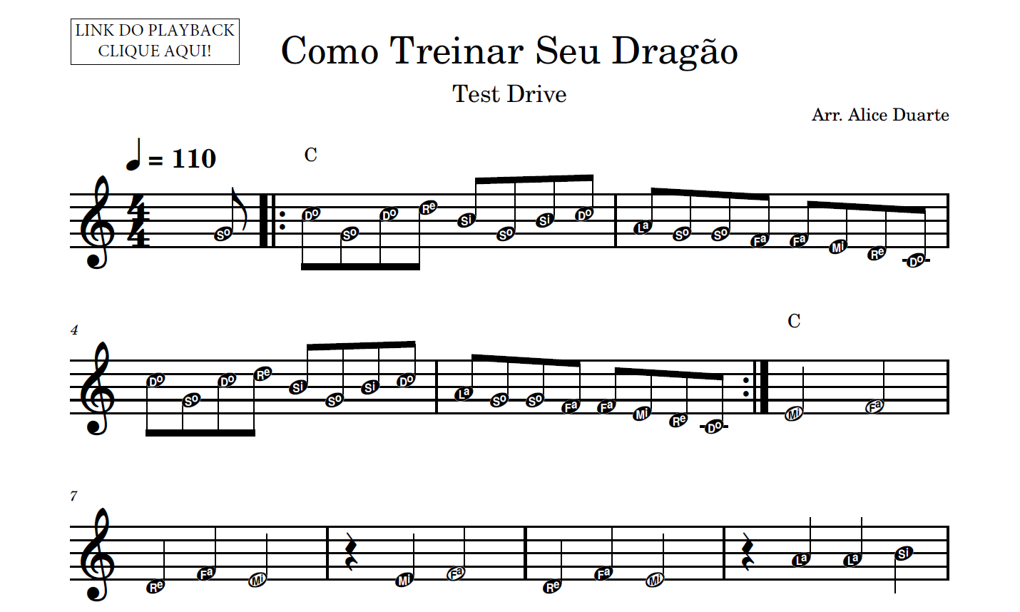 Partitura facilitada com a transcrição do arranjo da música “Test Drive”, do filme Como Treinar Seu Dragão, disponível em vídeo no link do YouTube: Como Treinar Seu Dragão (Test Drive) | Tutorial | Aprenda com Partitura Facilitada + Playback