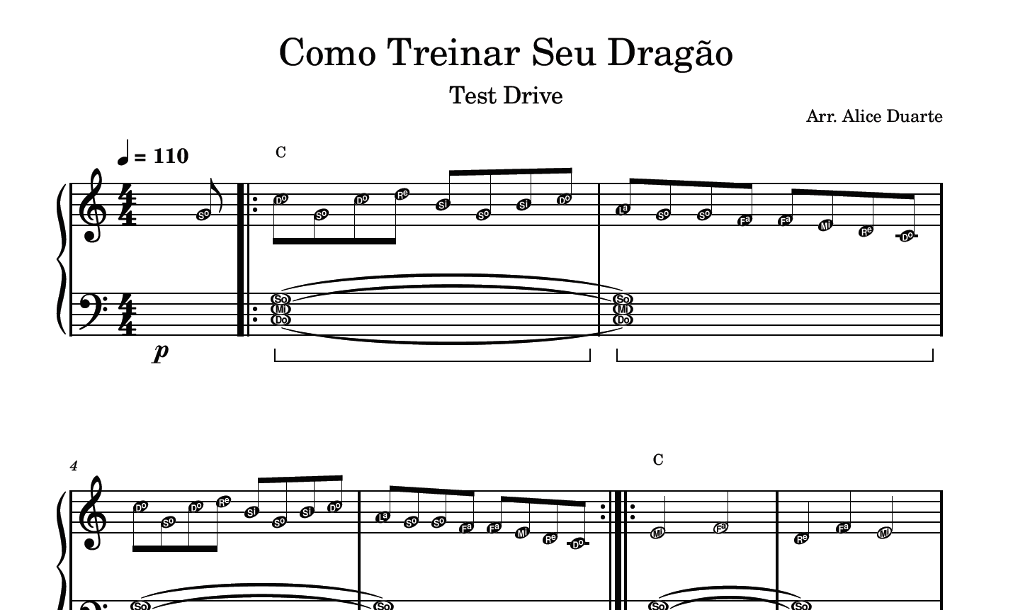 Partitura com a transcrição do arranjo da música “Test Drive”, do filme Como Treinar Seu Dragão, disponível em vídeo no link do YouTube: Como Treinar Seu Dragão (Test Drive) | Piano Tutorial + Partitura
