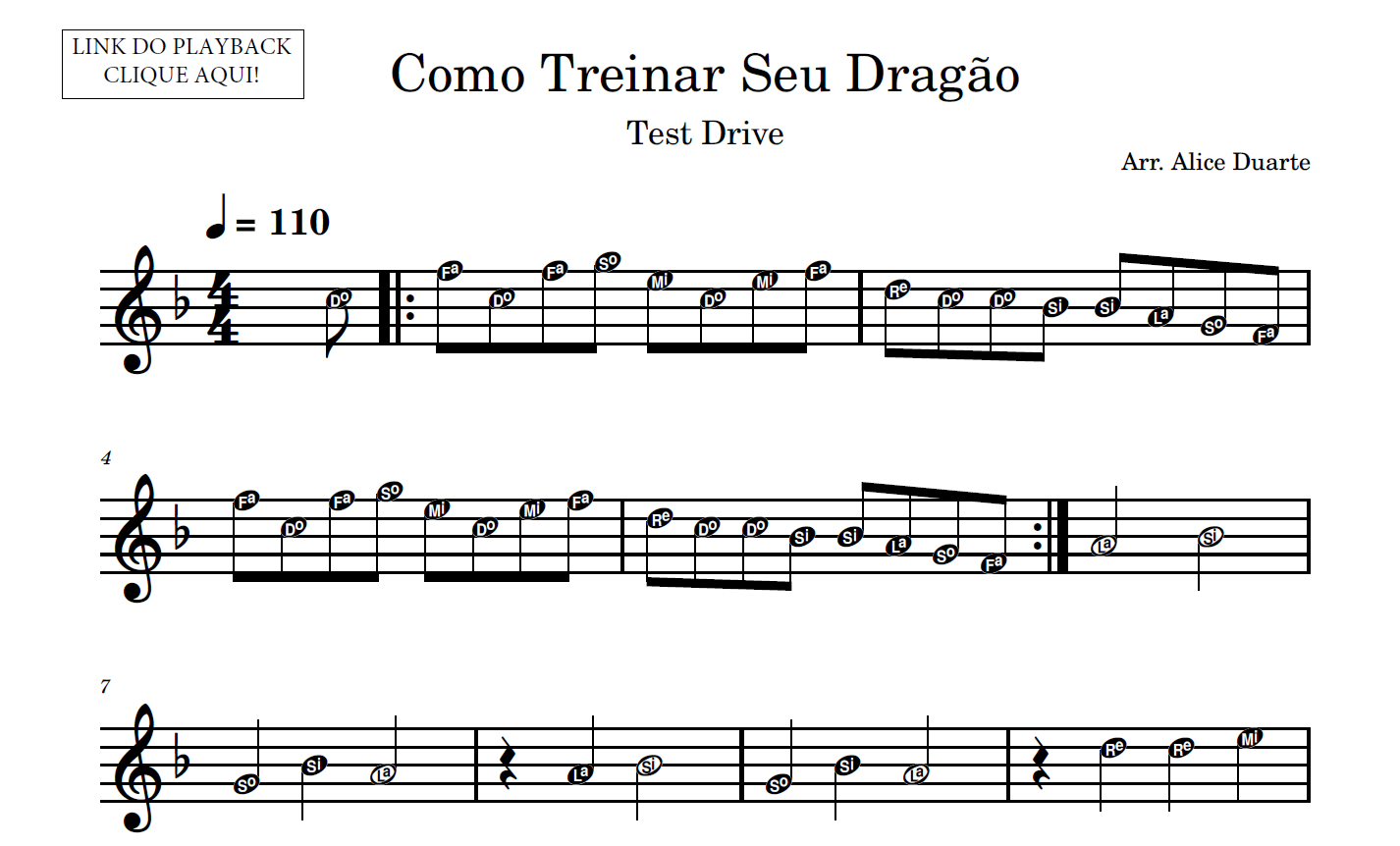 Partitura em formato PDF, com melodia na clave de sol, nome das notas e link para o playback utilizado no vídeo.