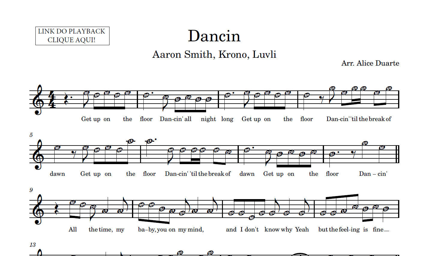 Partitura para Saxofone Alto com a transcrição da música “Dancin”, de Aaron Smith, Krono, Luvli.