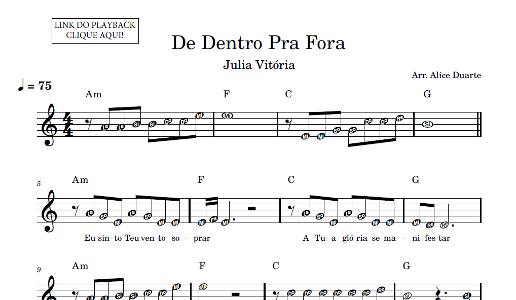 Partitura facilitada com a transcrição do arranjo da música “De Dentro Pra Fora”, de Julia Vitória, disponível em vídeo no link do YouTube: De Dentro Pra Fora (Julia Vitória) | Tutorial | Aprenda a tocar com Partitura Facilitada + Playback