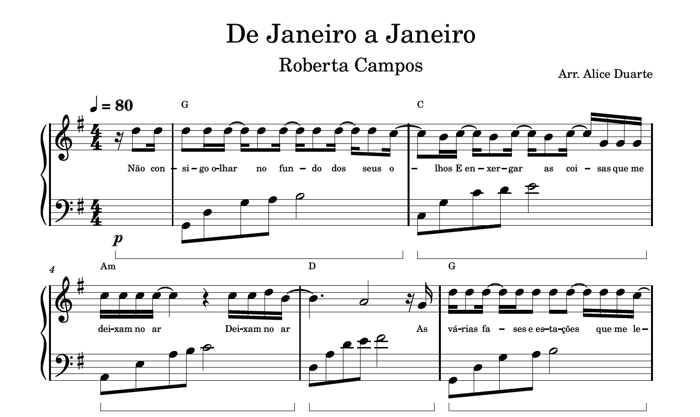 Partitura com a transcrição do arranjo da música “De Janeiro a Janeiro”, de Roberta Campos, disponível em vídeo no link do YouTube: De Janeiro a Janeiro (Roberta Campos) | Piano Tutorial + Partitura