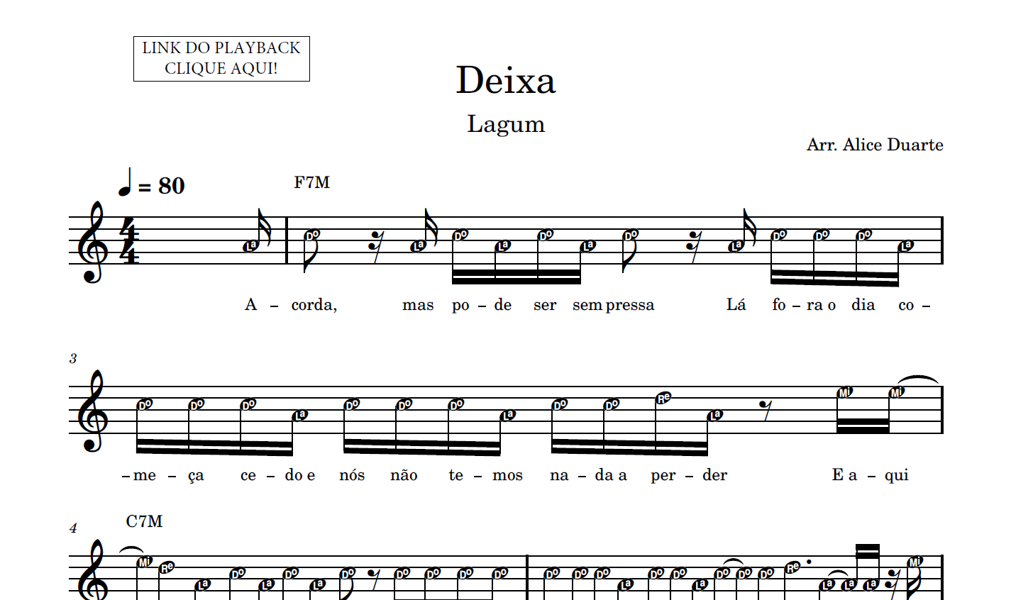 Partitura facilitada com a transcrição do arranjo da música “Deixa”, de Lagum, disponível em vídeo no link do YouTube: Deixa (Lagum) | Tutorial | Aprenda a tocar com Partitura Facilitada + Playback