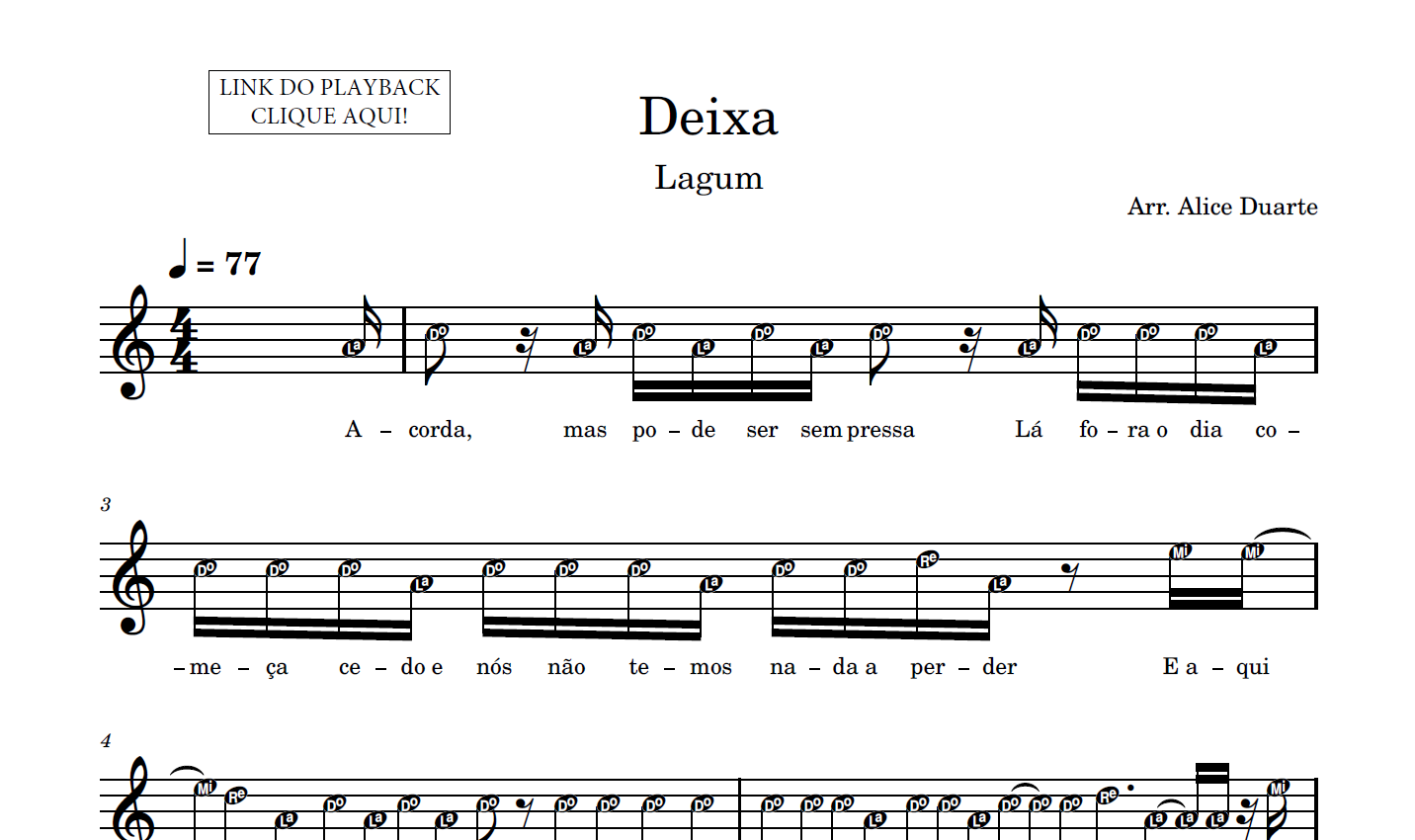 Partitura em formato PDF, com melodia na clave de sol, letra da música, nome das notas e link para o playback utilizado no vídeo.