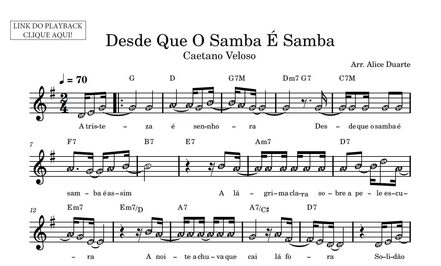Partitura facilitada com a transcrição do arranjo da música “Desde Que O Samba É Samba”, de Caetano Veloso, disponível em vídeo no link do YouTube: Desde Que O Samba É Samba (Caetano Veloso) | Tutorial | Aprenda com Partitura Facilitada + Playback