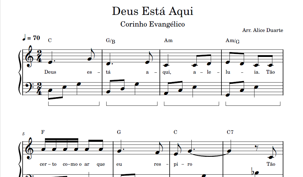 Partitura com a transcrição do arranjo do Corinho Evangélico “Deus Está Aqui”, disponível em vídeo no link do YouTube: Deus Está Aqui (Corinho Evangélico) | Piano Tutorial + Partitura