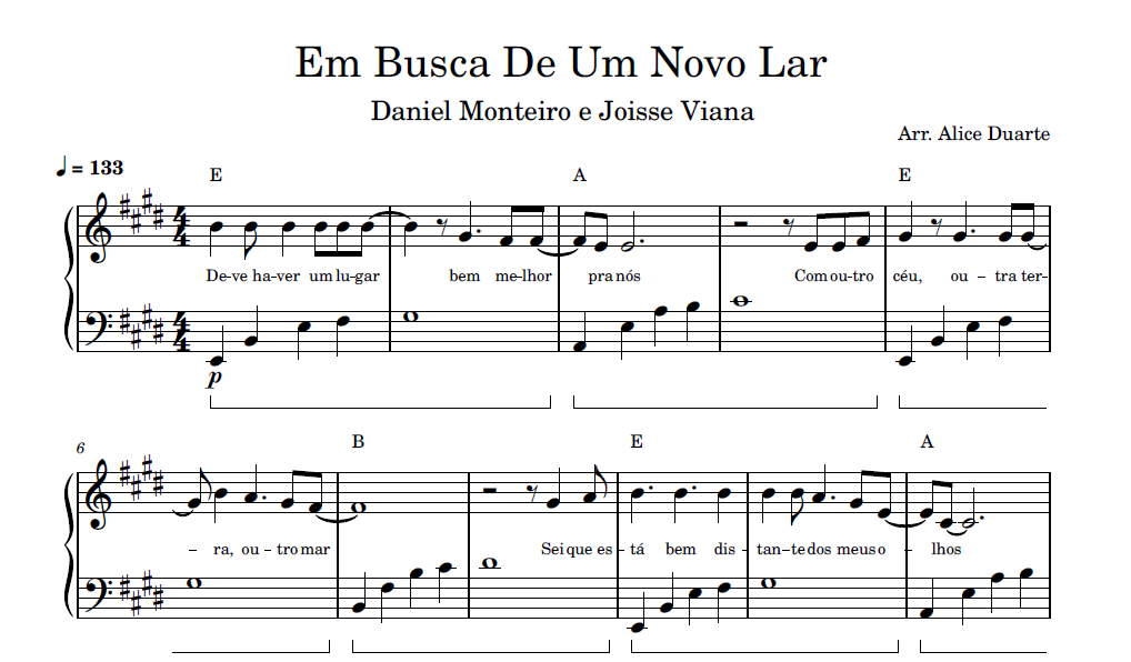 Partitura com a transcrição do arranjo da música “Em Busca De Um Novo Lar”, de Daniel Monteiro e Joisse Viana, disponível em vídeo no link do YouTube: Em Busca De Um Novo Lar (Daniel Monteiro e Joisse Viana) | Piano Tutorial + Partitura – YouTube