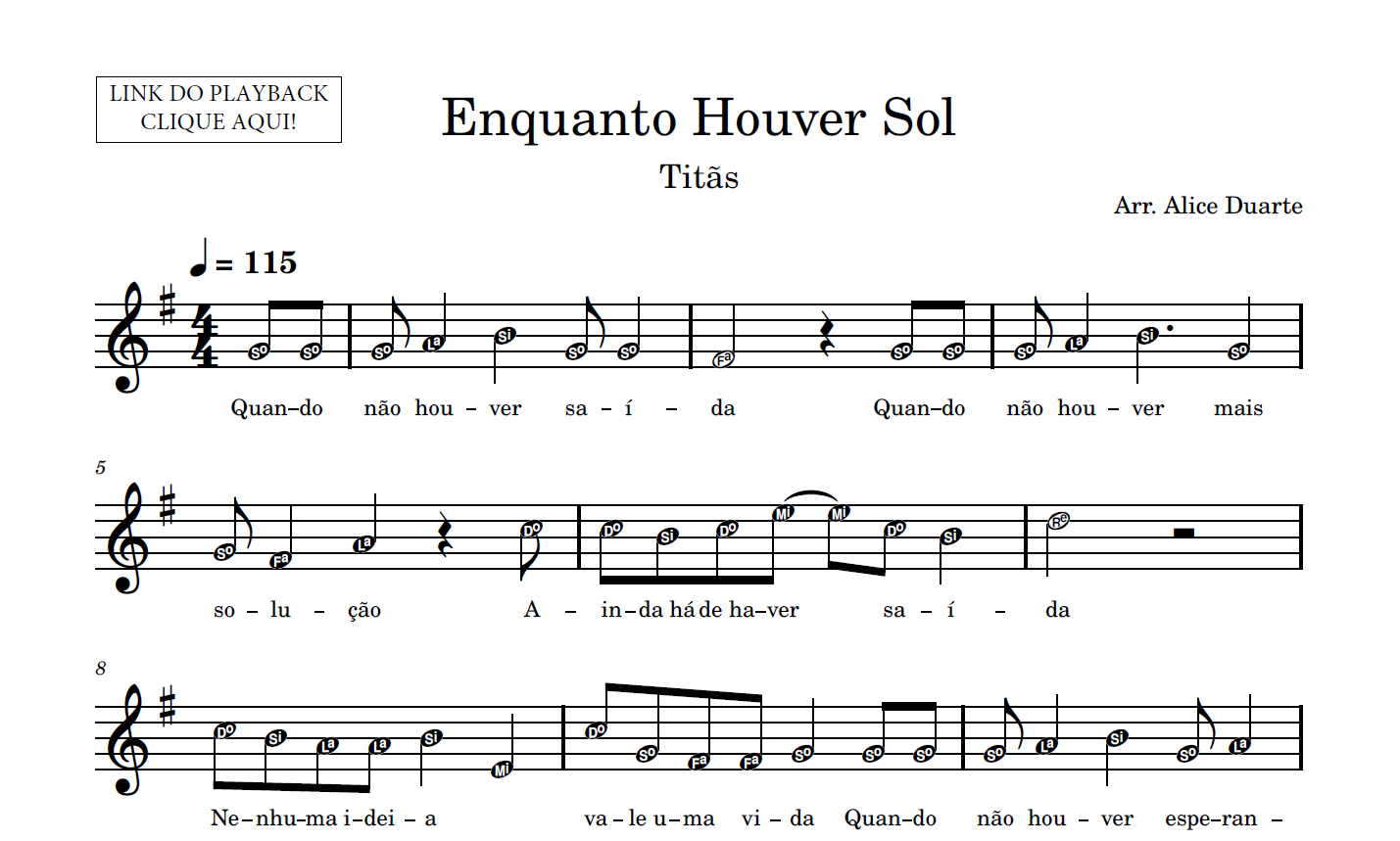 Partitura em formato PDF, com melodia na clave de sol, letra da música, nome das notas e link para o playback utilizado no vídeo.