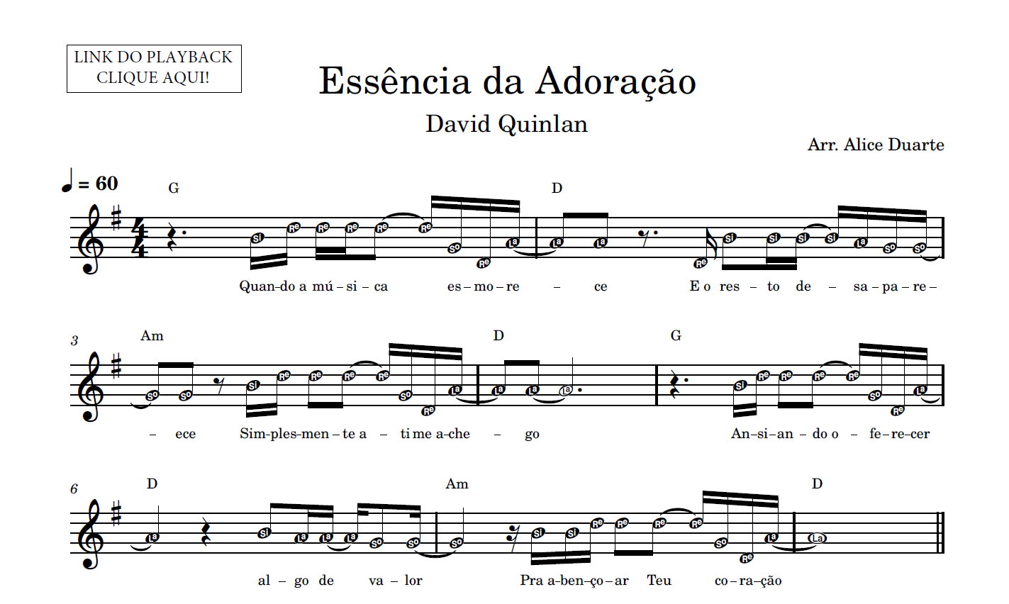 Partitura facilitada com a transcrição do arranjo da música “Essência Da Adoração”, de David Quinlan, disponível em vídeo no link do YouTube: Essência Da Adoração (David Quinlan) | Tutorial | Aprenda com Partitura Facilitada + Playback – YouTube