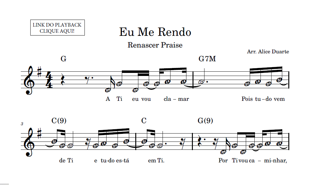 Partitura facilitada com a transcrição do arranjo da música “Eu Me Rendo”, de Renascer Praise, disponível em vídeo no link do YouTube: Eu Me Rendo (Renascer Praise) | Tutorial | Aprenda a tocar com Partitura Facilitada + Playback