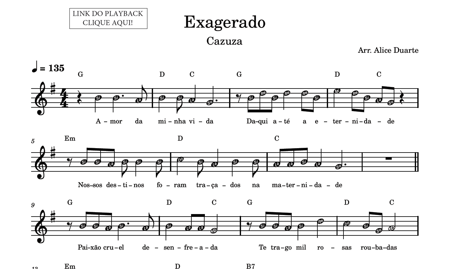 A partitura é em formato PDF e contém melodia, legenda de notas, cifragem, letra da música e link clicável do playback utilizado no vídeo.