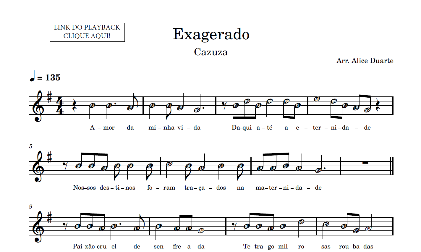 Partitura em formato PDF, com melodia na clave de sol, letra da música, nome das notas e link para o playback utilizado no vídeo.