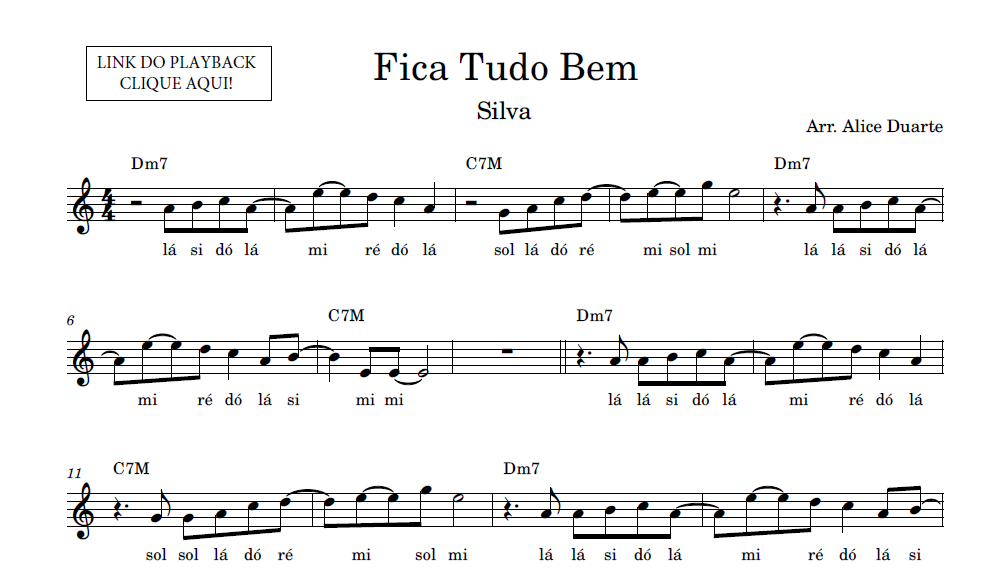 Partitura facilitada com a transcrição do arranjo da música “Fica Tudo Bem” de Silva, disponível em vídeo no link do YouTube: Fica Tudo Bem (Silva) | Aprenda a tocar com Partitura Facilitada + Playback (youtube.com).