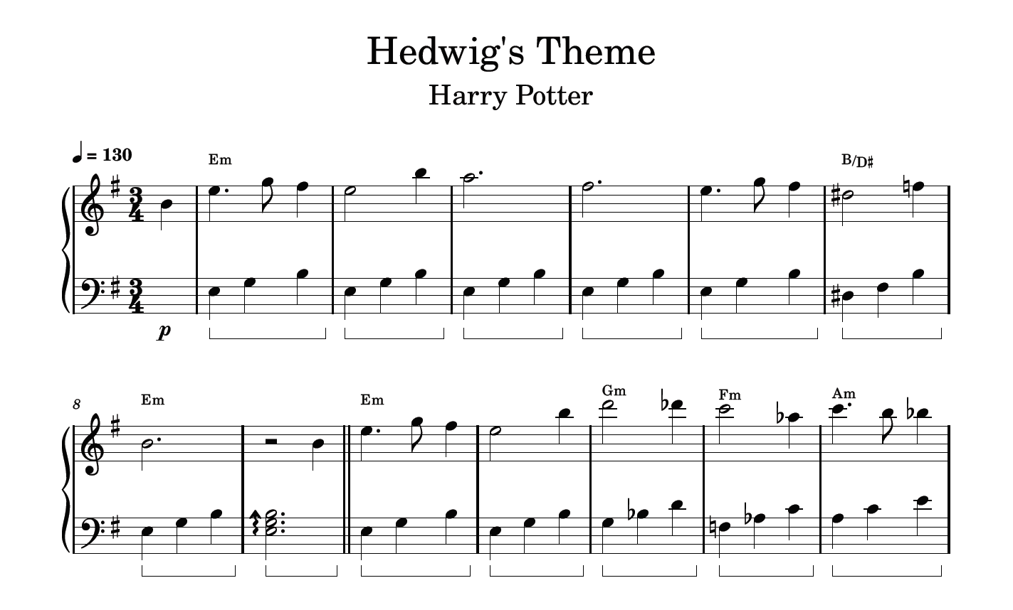 Partitura com a transcrição do arranjo da música “Hedwig’s Theme”, do filme Harry Potter, disponível em vídeo no link do YouTube: Hedwig’s Theme (Harry Potter) | Piano Tutorial + Partitura