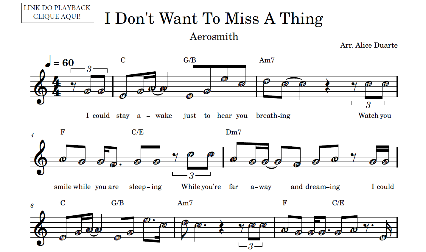 Partitura facilitada com a transcrição do arranjo da música “I Don’t Want To Miss A Thing”, de Aerosmith, disponível em vídeo no link do YouTube: I Don’t Want To Miss A Thing (Aerosmith) | Tutorial | Aprenda com Partitura Facilitada + Playback – YouTube