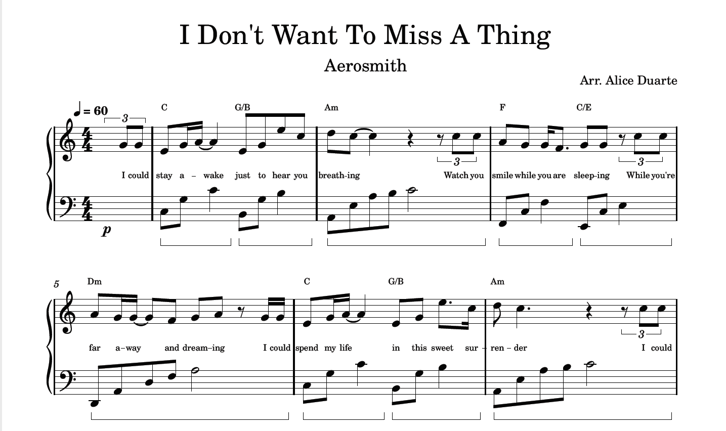 Partitura com a transcrição do arranjo da música “I Don’t Want To Miss A Thing”, de Aerosmith, disponível em vídeo no link do YouTube: I Don’t Want To Miss A Thing (Aerosmith) | Piano Tutorial + Partitura – YouTube