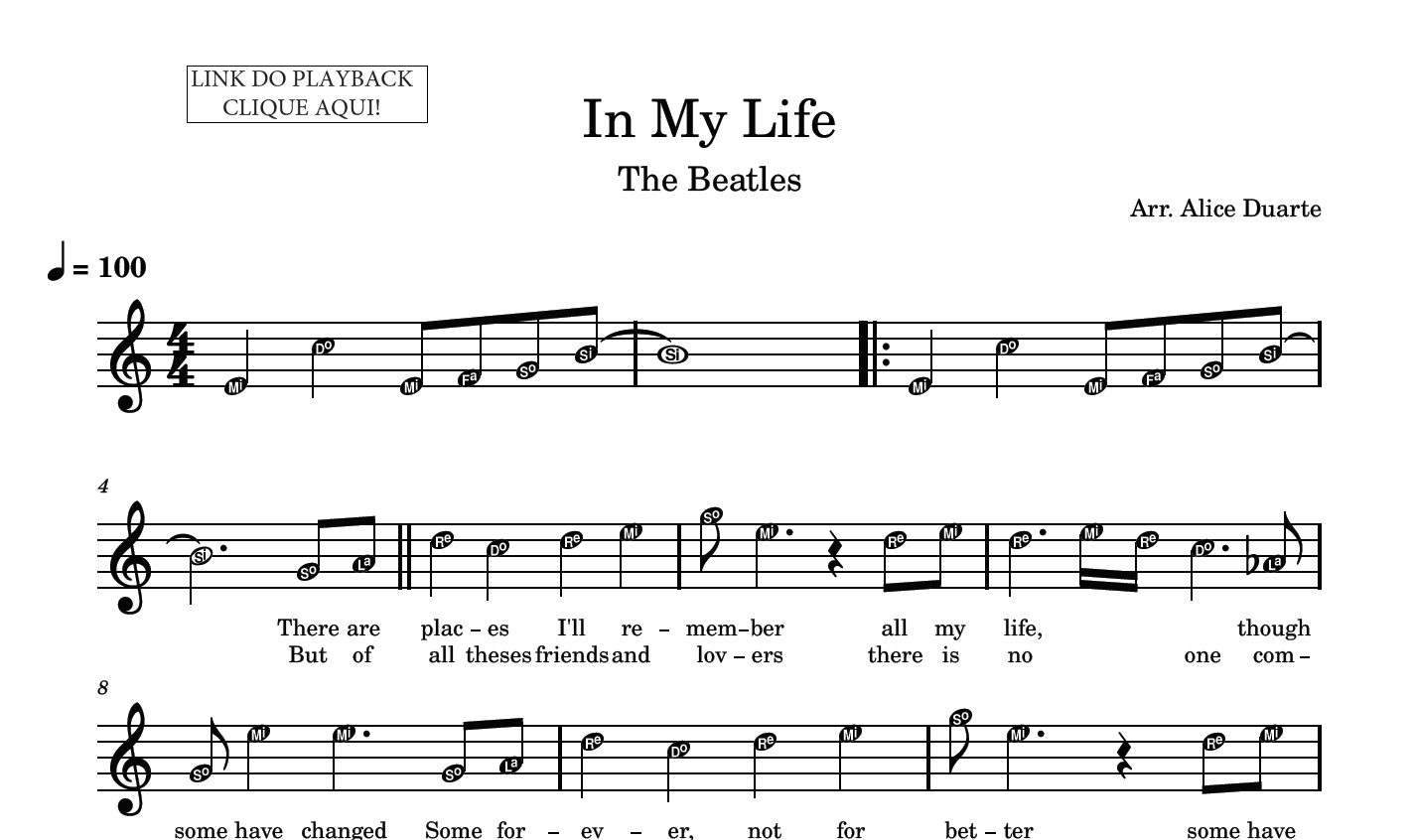 Partitura em formato PDF, com melodia na clave de sol, letra da música, nome das notas e link para o playback utilizado no vídeo.