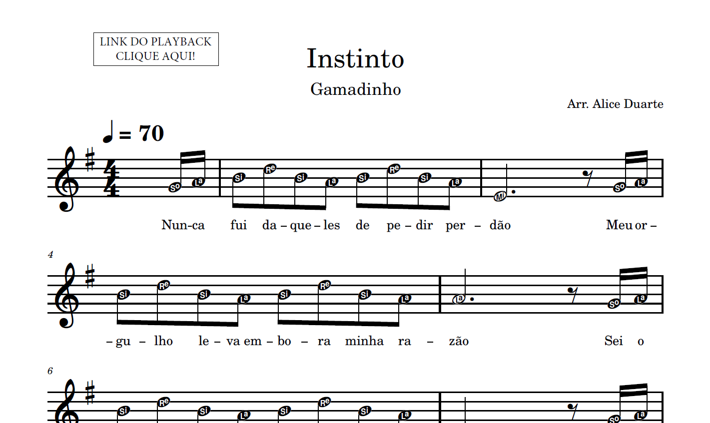 Partitura em formato PDF, com melodia na clave de sol, letra da música, nome das notas e link para o playback utilizado no vídeo.