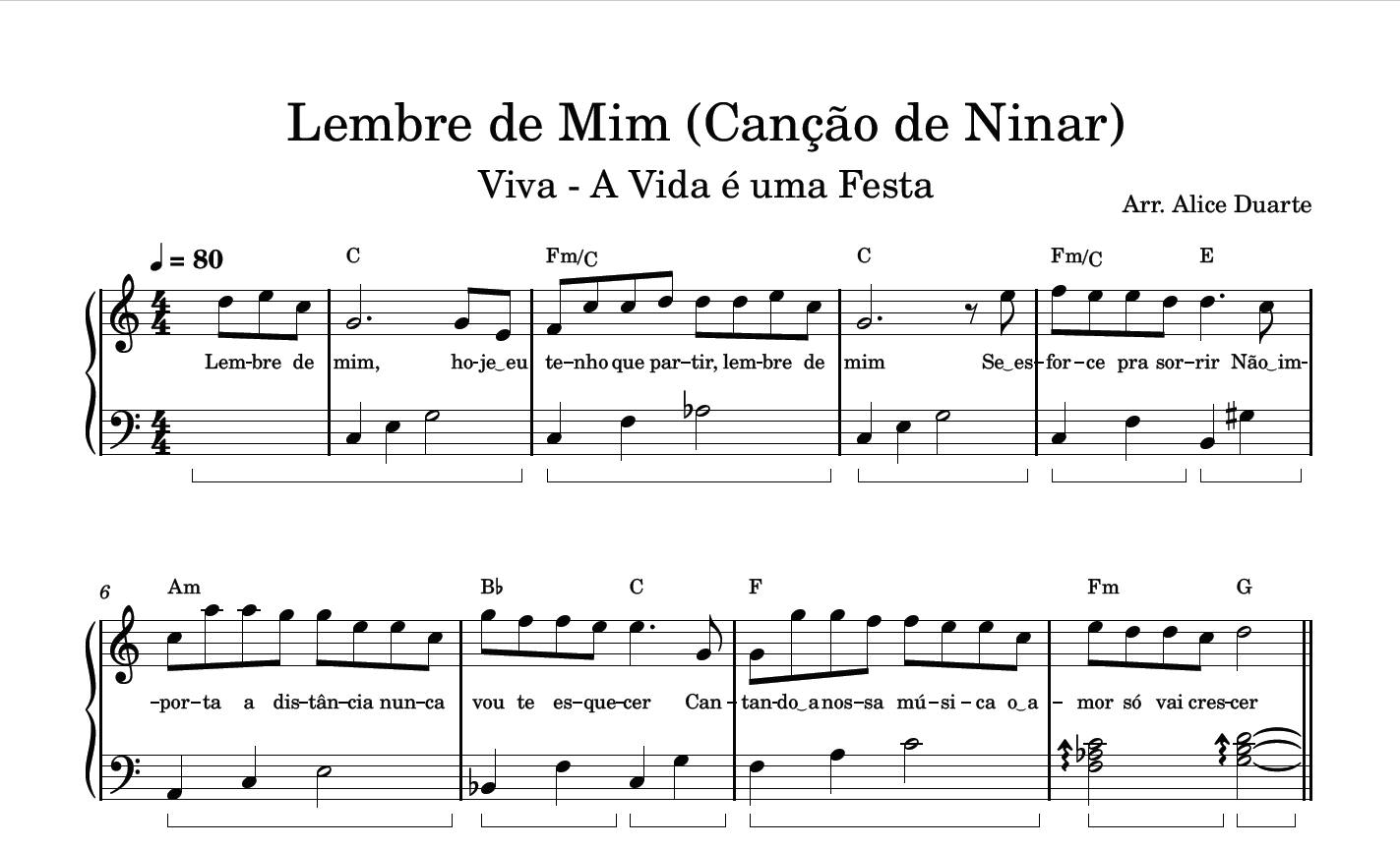 Partitura com a transcrição do arranjo da música “Lembre de Mim”, do filme Viva – A Vida é uma Festa, disponível em vídeo no link do YouTube: Lembre de Mim (Viva – A Vida é uma Festa) | Piano Tutorial + Partitura | Versão 2 – YouTube