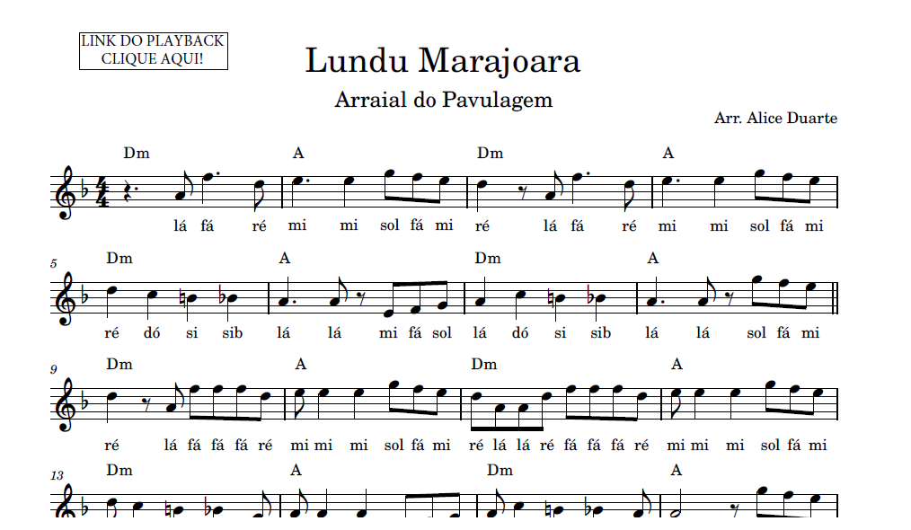 Partitura facilitada com a transcrição do arranjo da música “Lundu Marajoara”, de Arraial do Pavulagem, disponível em vídeo no link do YouTube: Lundu Marajoara | Tutorial | Aprenda a tocar com Partitura Facilitada + Playback – YouTube