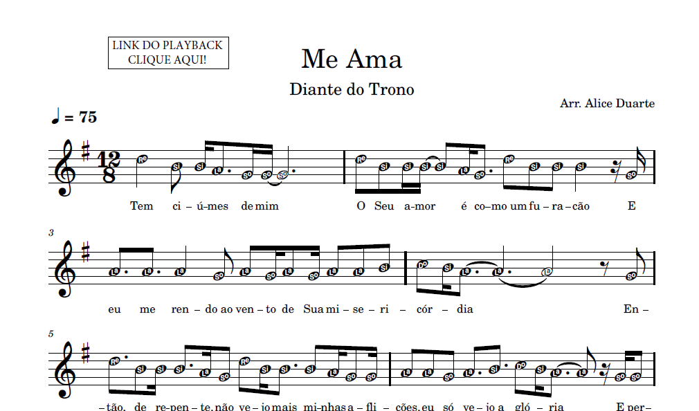 Partitura em formato PDF, com melodia na clave de sol, letra da música, nome das notas e link para o playback utilizado no vídeo.