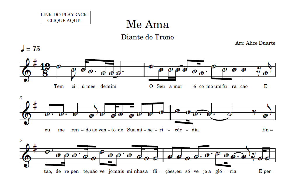 Partitura em formato PDF, com melodia na clave de sol, letra da música, nome das notas e link para o playback utilizado no vídeo.