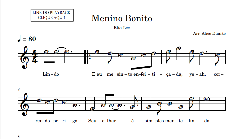 Partitura em formato PDF, com melodia na clave de sol, letra da música, nome das notas e link para o playback utilizado no vídeo.