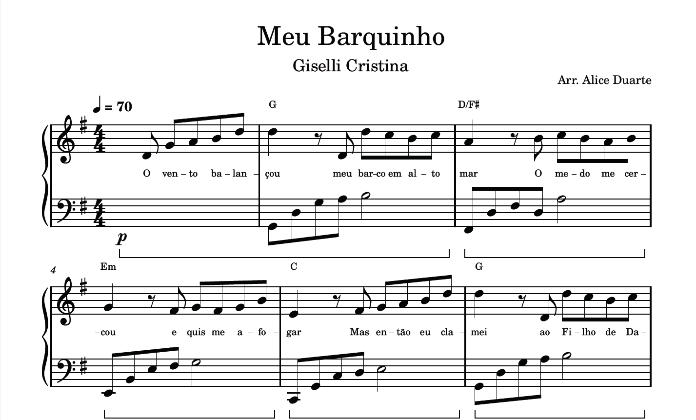 Partitura com a transcrição do arranjo da música “Meu Barquinho”, de Giselli Cristina, disponível em vídeo no link do YouTube: Meu Barquinho (Giselli Cristina) | Piano Tutorial + Partitura