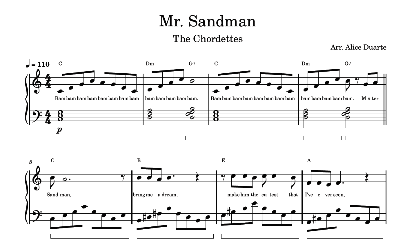 Partitura com a transcrição do arranjo da música “Mr. Sandman”, de The Chordettes, disponível em vídeo no link do YouTube: Mr. Sandman (The Chordettes) | Piano Tutorial + Partitura